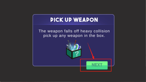 4、拾取武器:完成训练后点击“PICKUP WEAPON”,若武器因碰撞掉落,走进武器箱即可自动拾取并点击“NEXT”继续冒险。