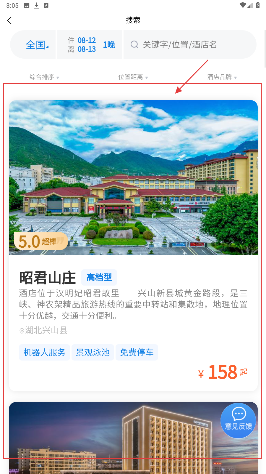 3、浏览搜索结果,看酒店详情(如【昭君山庄】介绍),筛选心仪酒店。