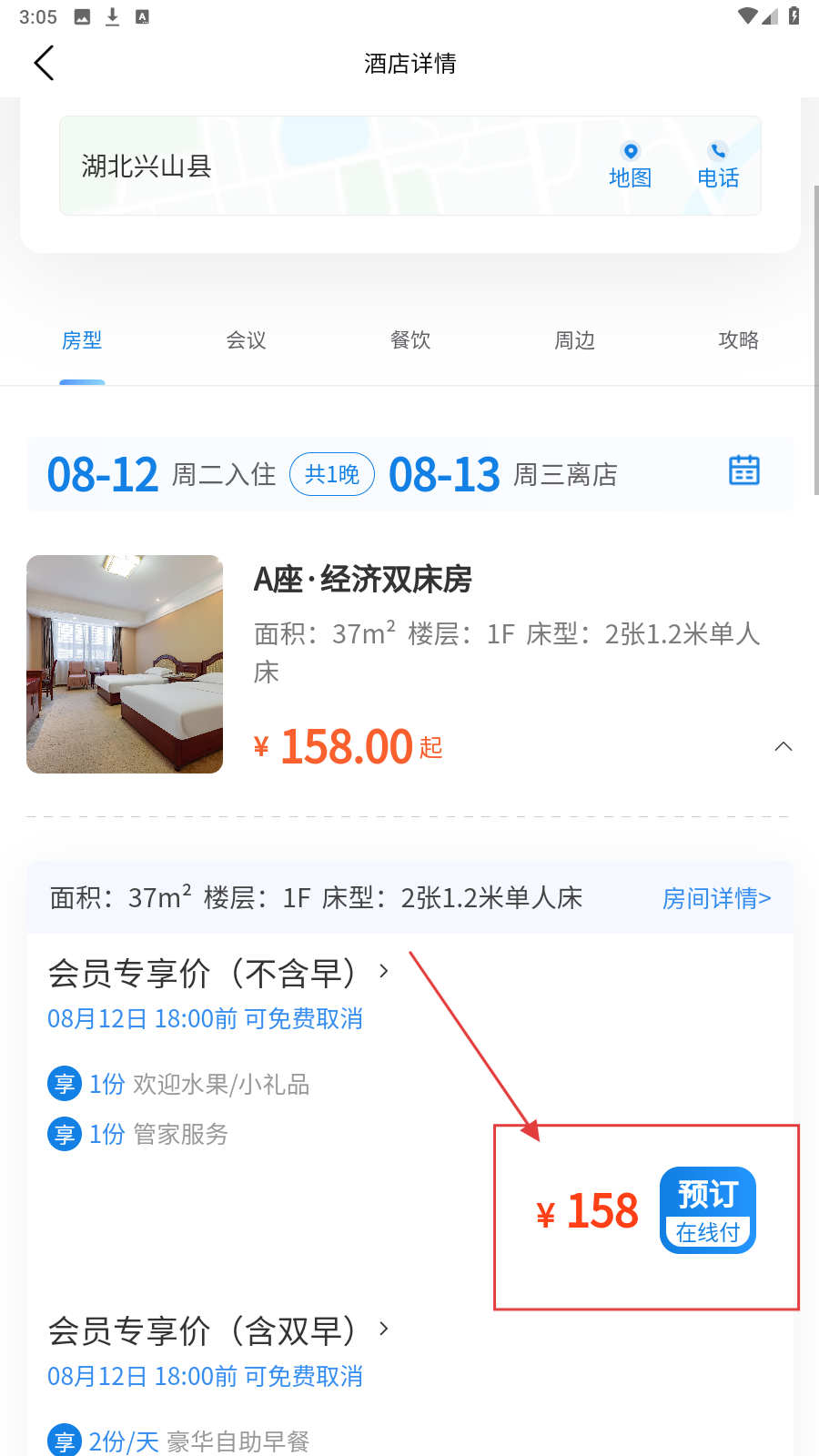 4、进入酒店详情页,选房型点【预订-在线付】,完成酒店预订。