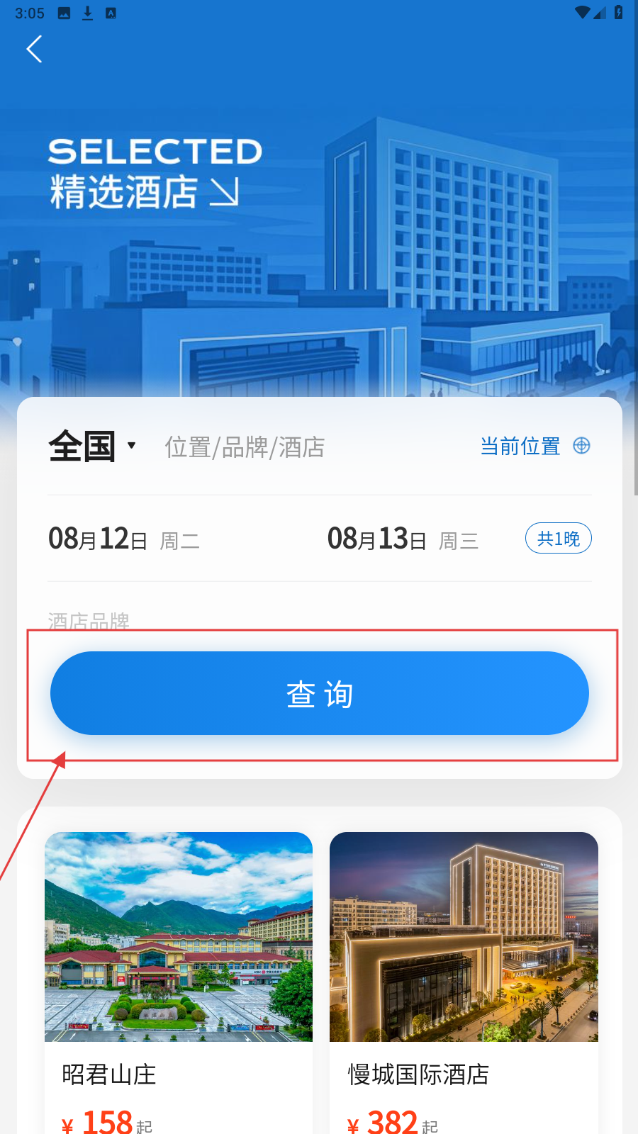 2、选位置、填日期,确认信息后点【查询】,找符合条件的酒店。