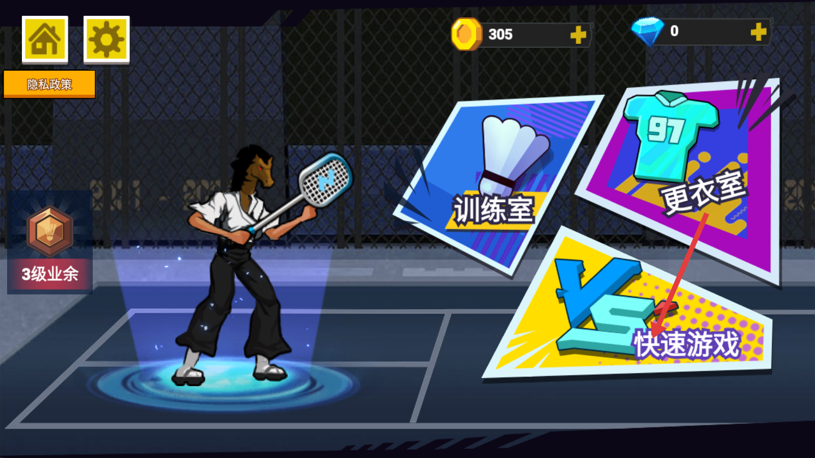 1、主界面点击【快速游戏】,以3级业余角色开启羽毛球对战,投身实时竞技。