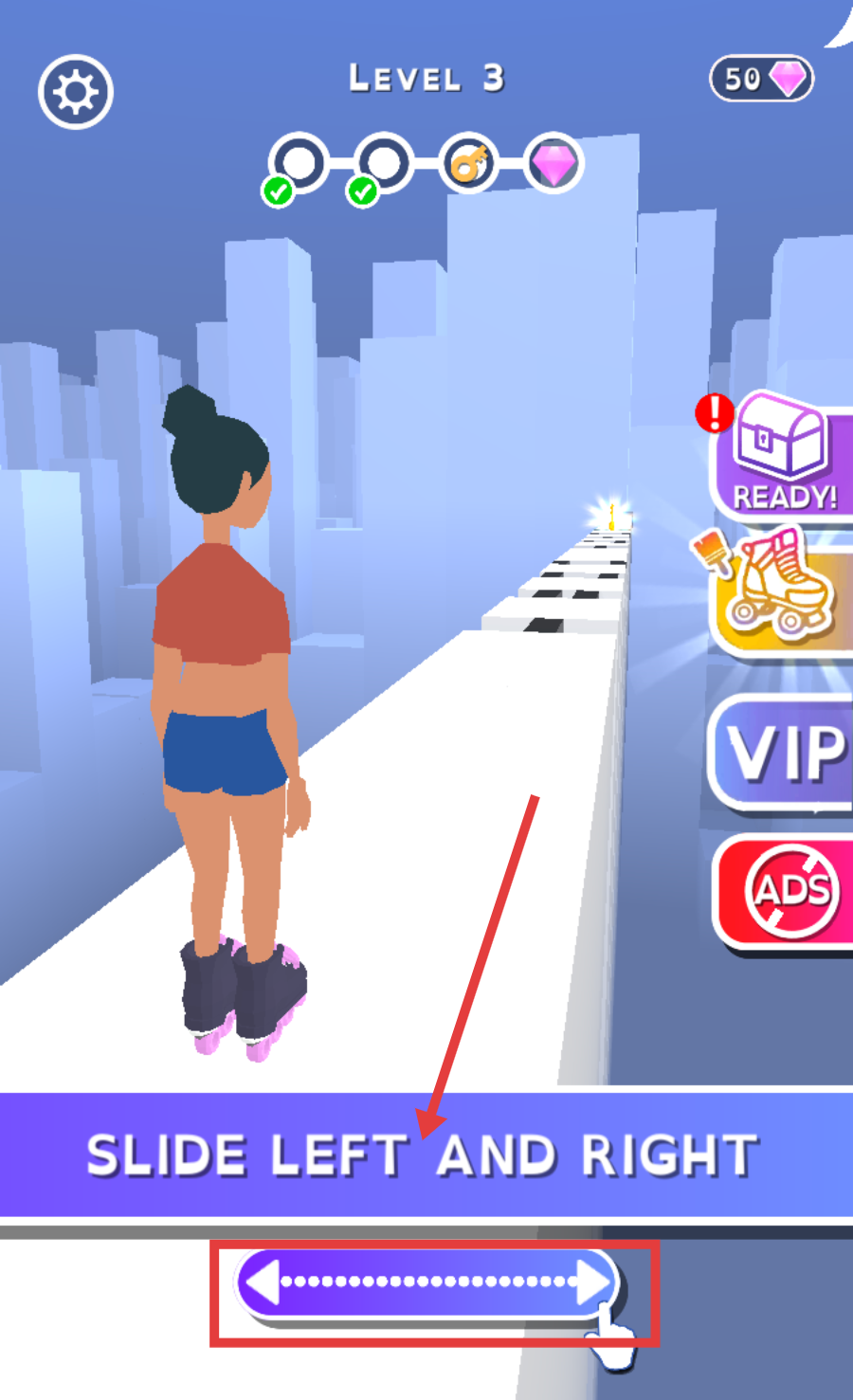 1、进入【LEVEL3】,通过底部【滑动条】左右滑动,操控轮滑角色出发。