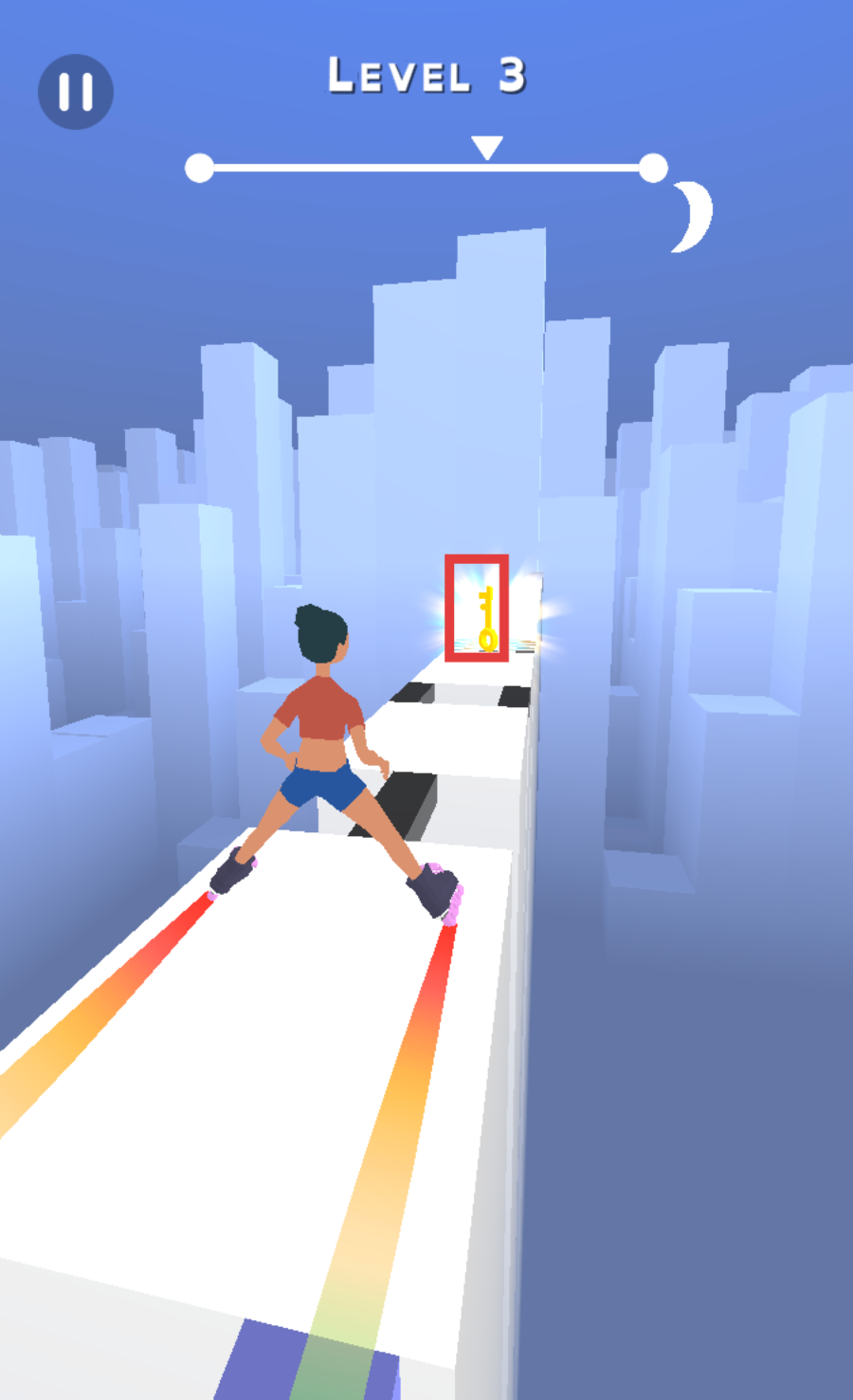 2、双腿张开轮滑鞋沿着黑色琴键通过沟壑,顶部进度条提示关卡进程。