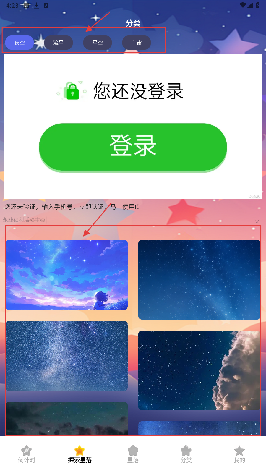 1、打开APP,在【分类】页选【夜空-流星-星空-宇宙】标签,浏览对应星空图片。