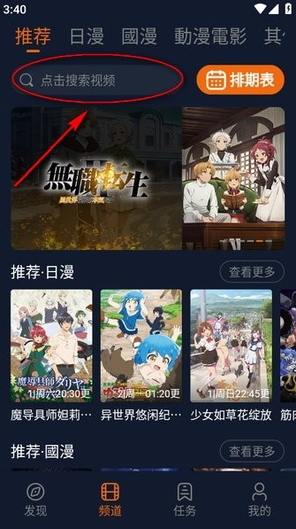 1、打开囧次元后,头部就是搜索框,显示的是“点击搜索视频”,如图所示;