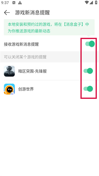 3、自己的游戏全部提醒都可以进行设置,点击关闭。