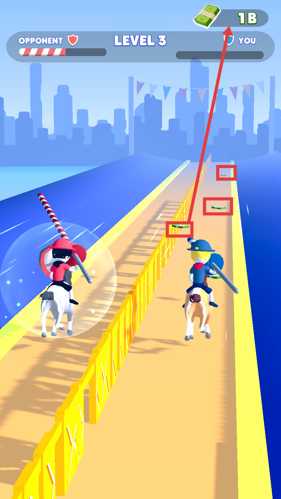 3、沿赛道拾取【绿色钞票】,兼顾收集与速度,多获取资源提升结算收益。