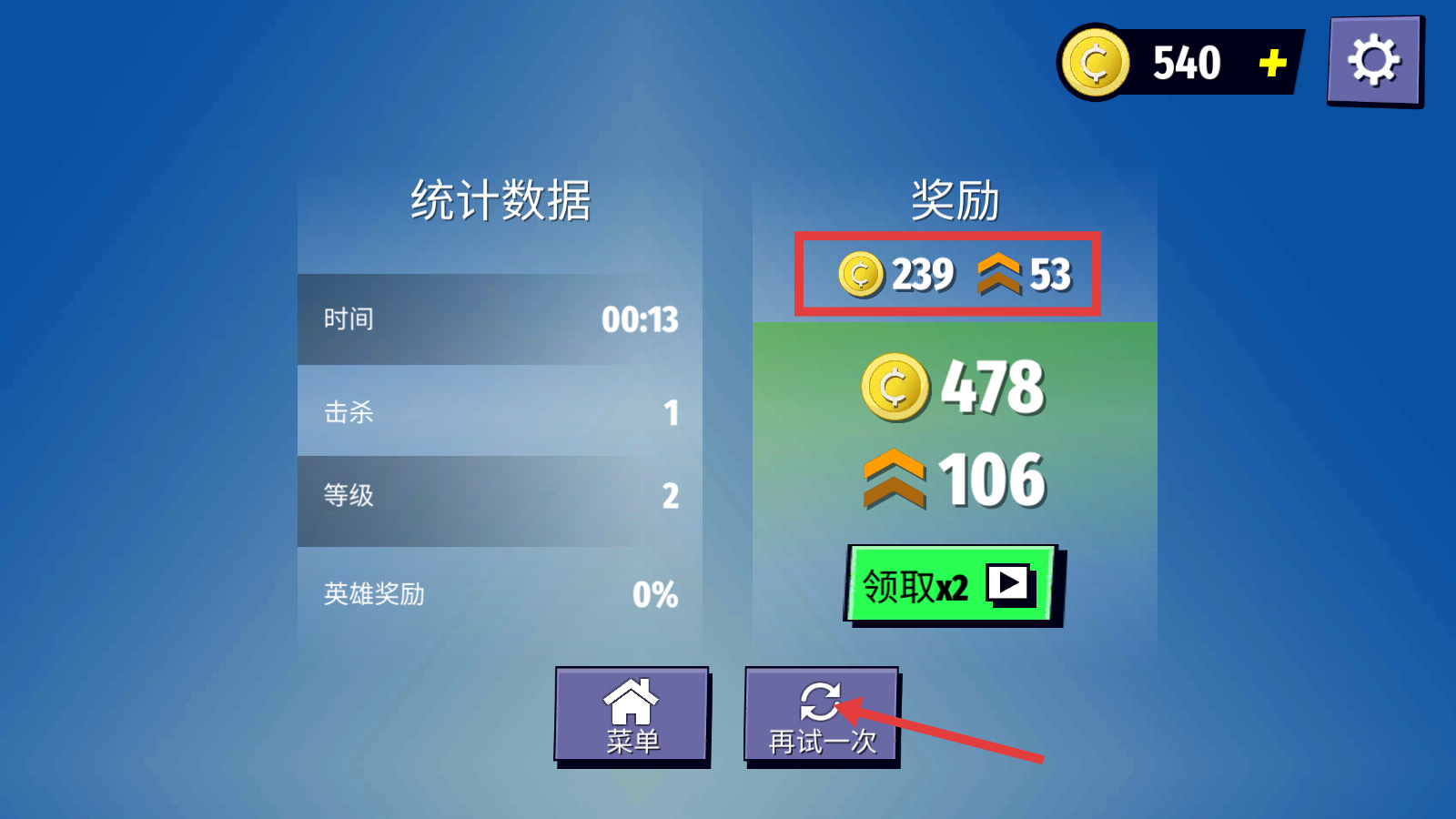 4、结算后若【239-金币】等奖励未达预期,点击【再试一次】,重刷关卡拿更高收益。