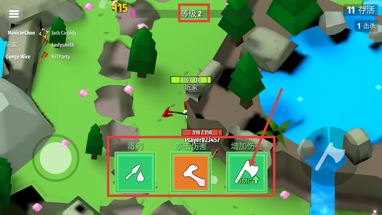 3、升级至【等级2】时,选【增加伤害】增益,强化输出,助力对抗其他存活玩家。