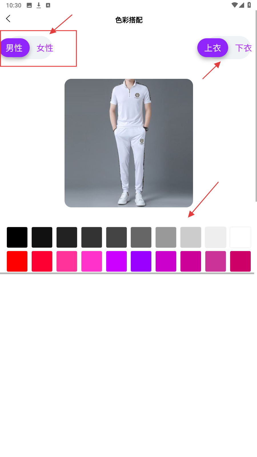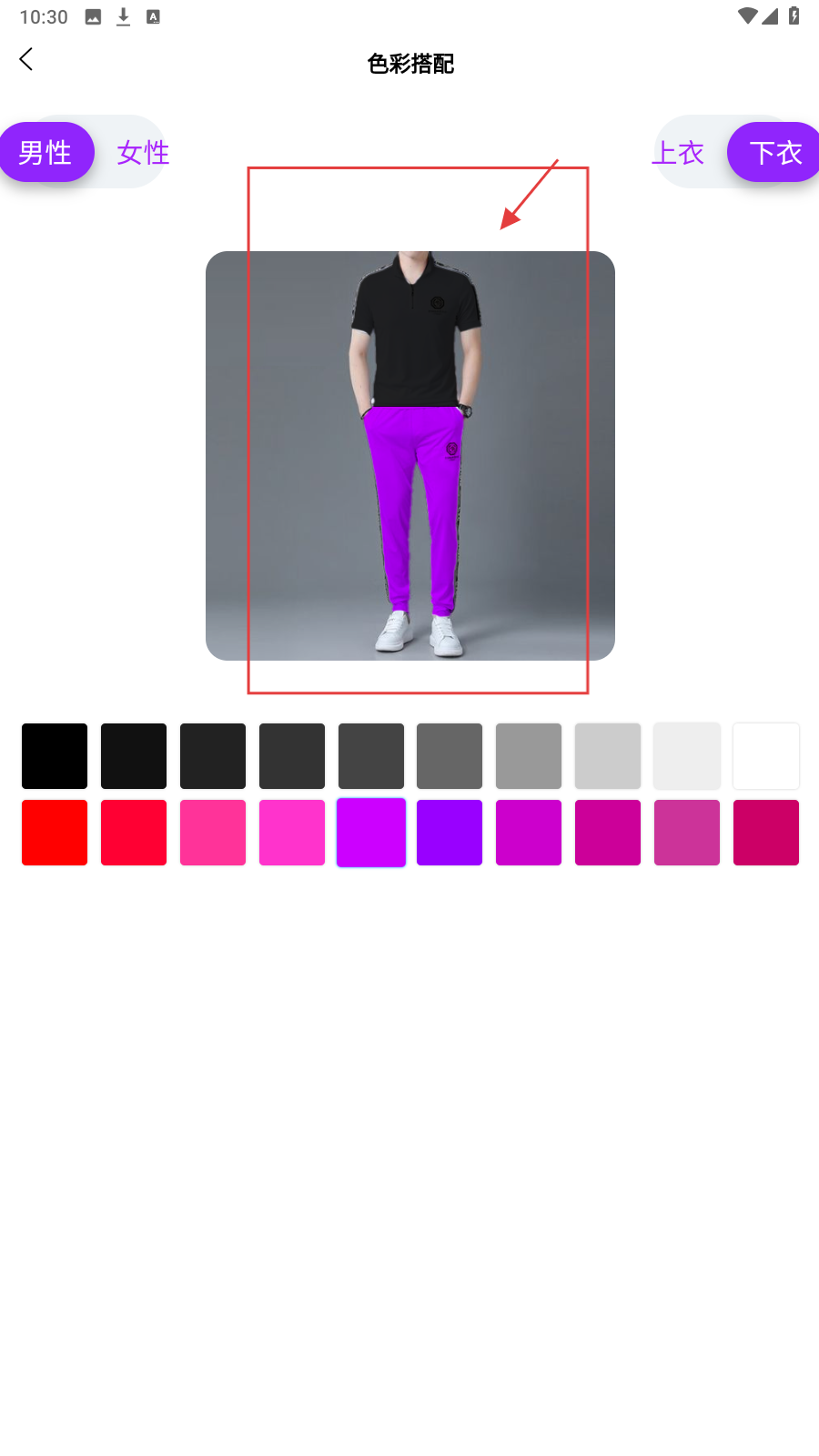 3、进入【色彩试搭】页面,可以切换男性女性,在下方进行色彩选择。