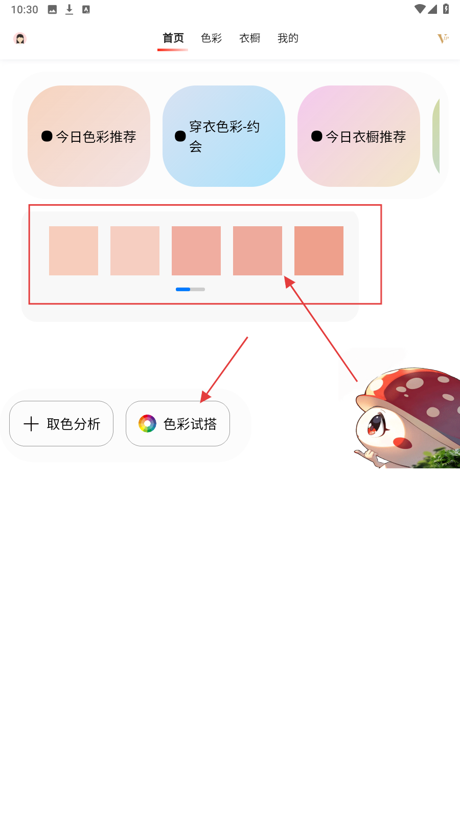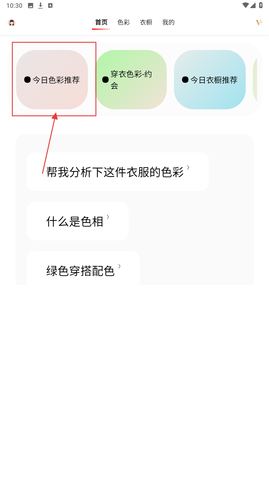 1、打开应用,点击【今日色彩推荐】按钮,获取色彩灵感。