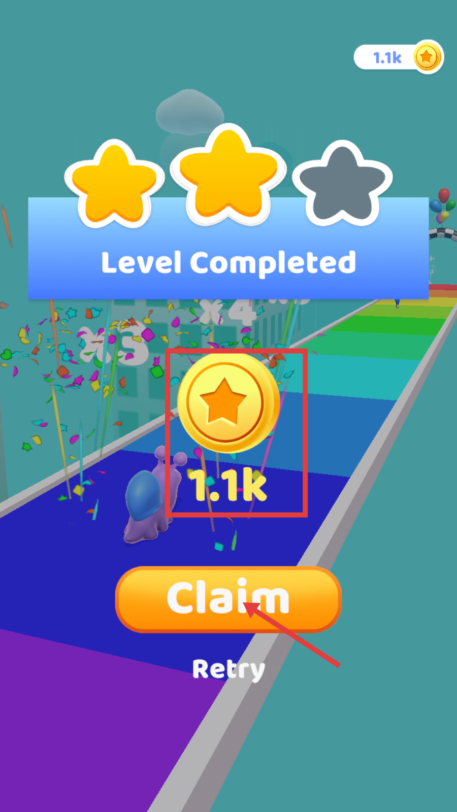 4、通关后点击【Claim】,领取【1.1k-金币】,积累资源解锁后续关卡与角色强化。