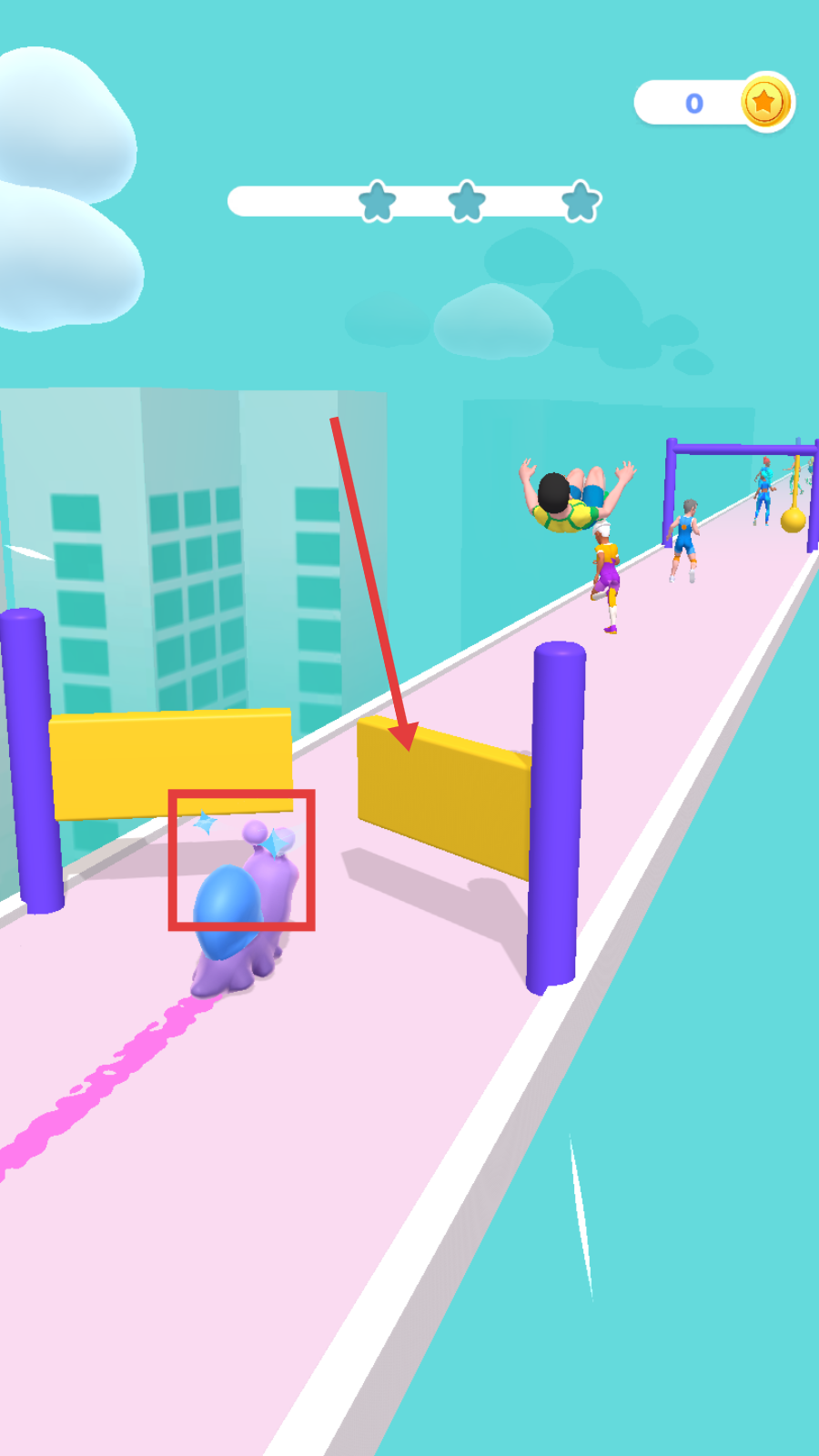 2、操控紫色角色,灵活避让【黄色挡板】等障碍,维持移动流畅性,避免减速。