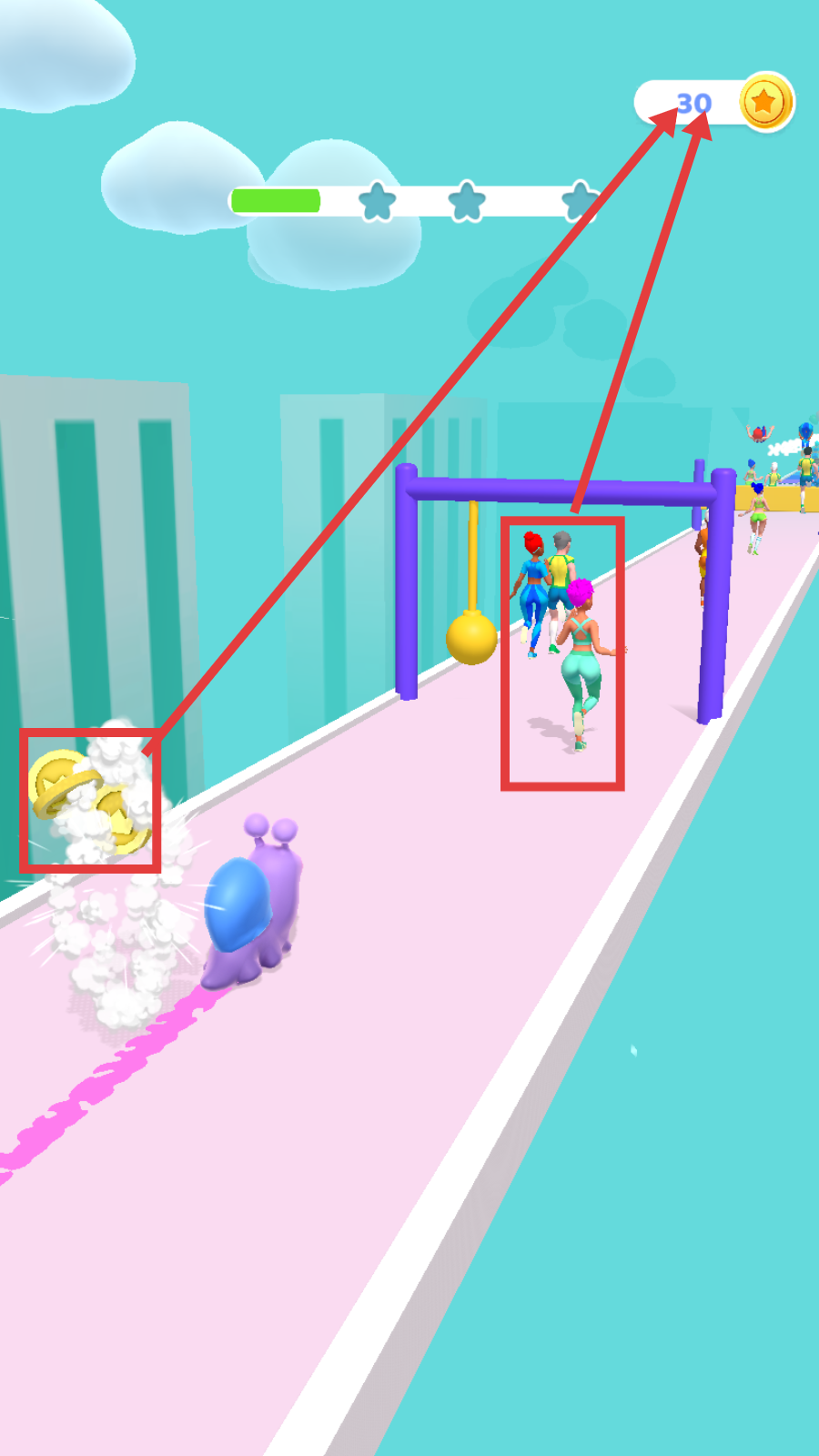 3、跑酷中优先采集【金币】,同步超越前方选手,提升右上角金币获取量(如30→1.1k)。