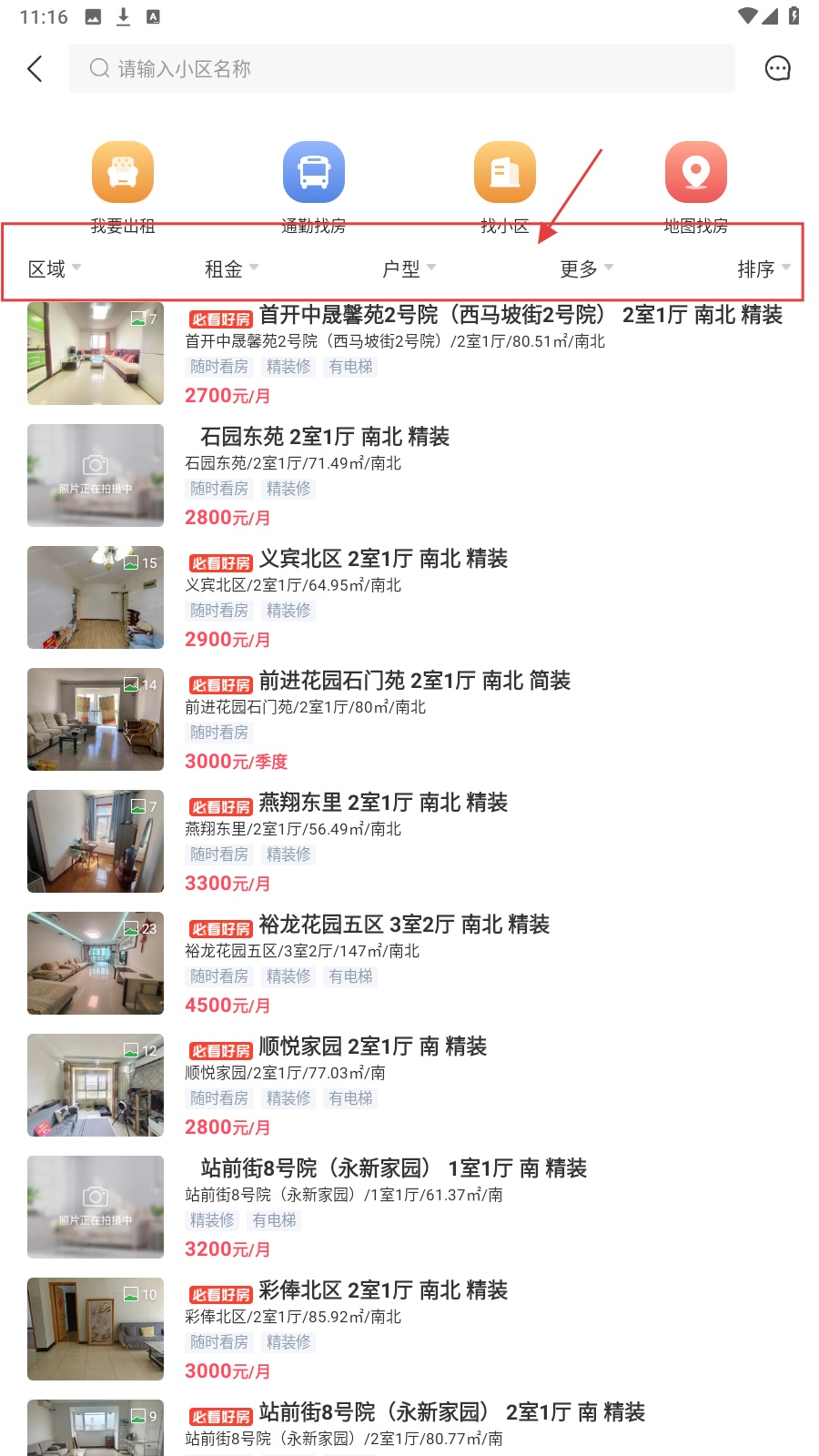 2、切换到租房页,用【区域-租金-户型】筛选项,精准找匹配房源。