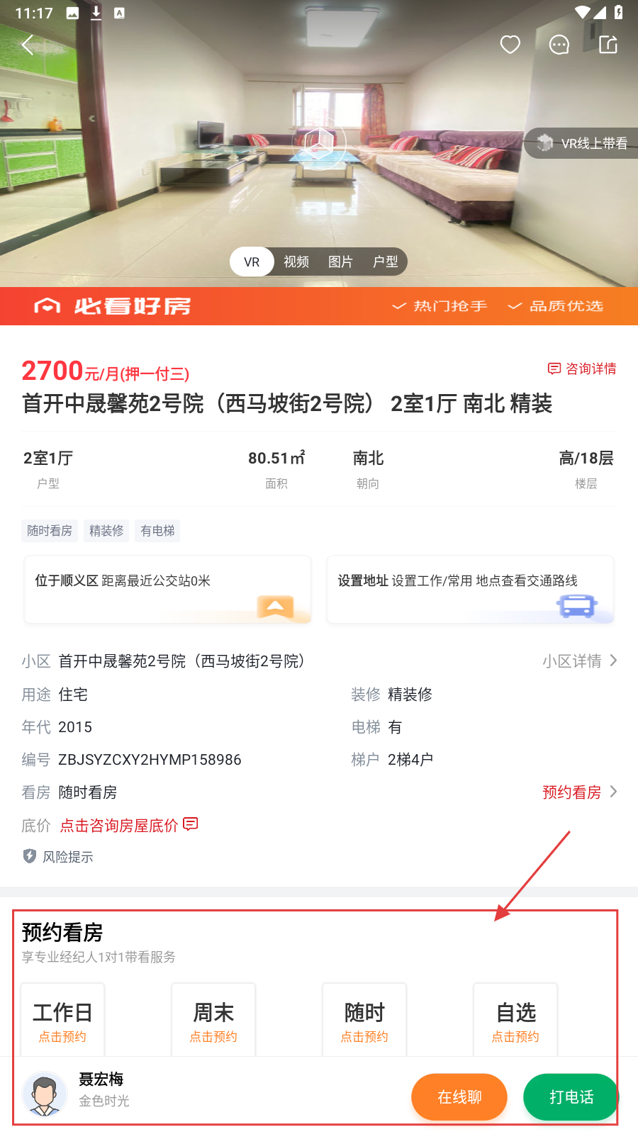 4、点房源进详情页,查【价格-户型-配套】,点【预约看房】联系经纪人。