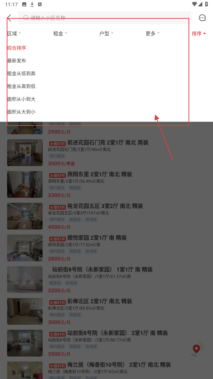 3、点【排序】,选【租金-面积】等排序方式,优化房源浏览顺序。