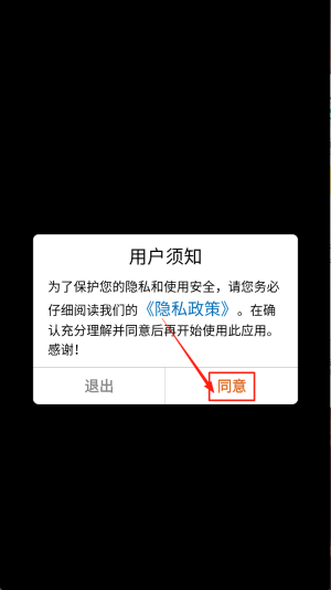 1、同意须知:在“用户须知”弹窗中,点击“同意”按钮,完成隐私政策确认。