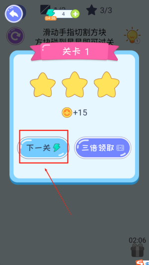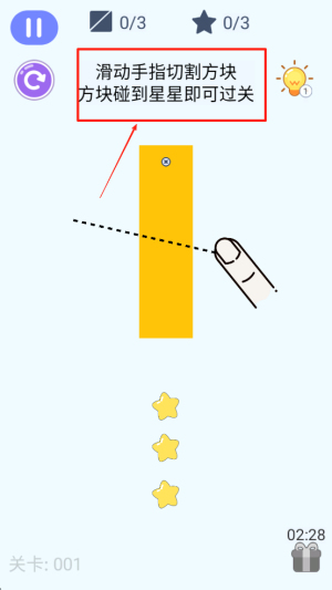 2、学习基本操作:在游戏关卡界面,按照提示滑动手指切割方块,使方块碰到星星以完成关卡。