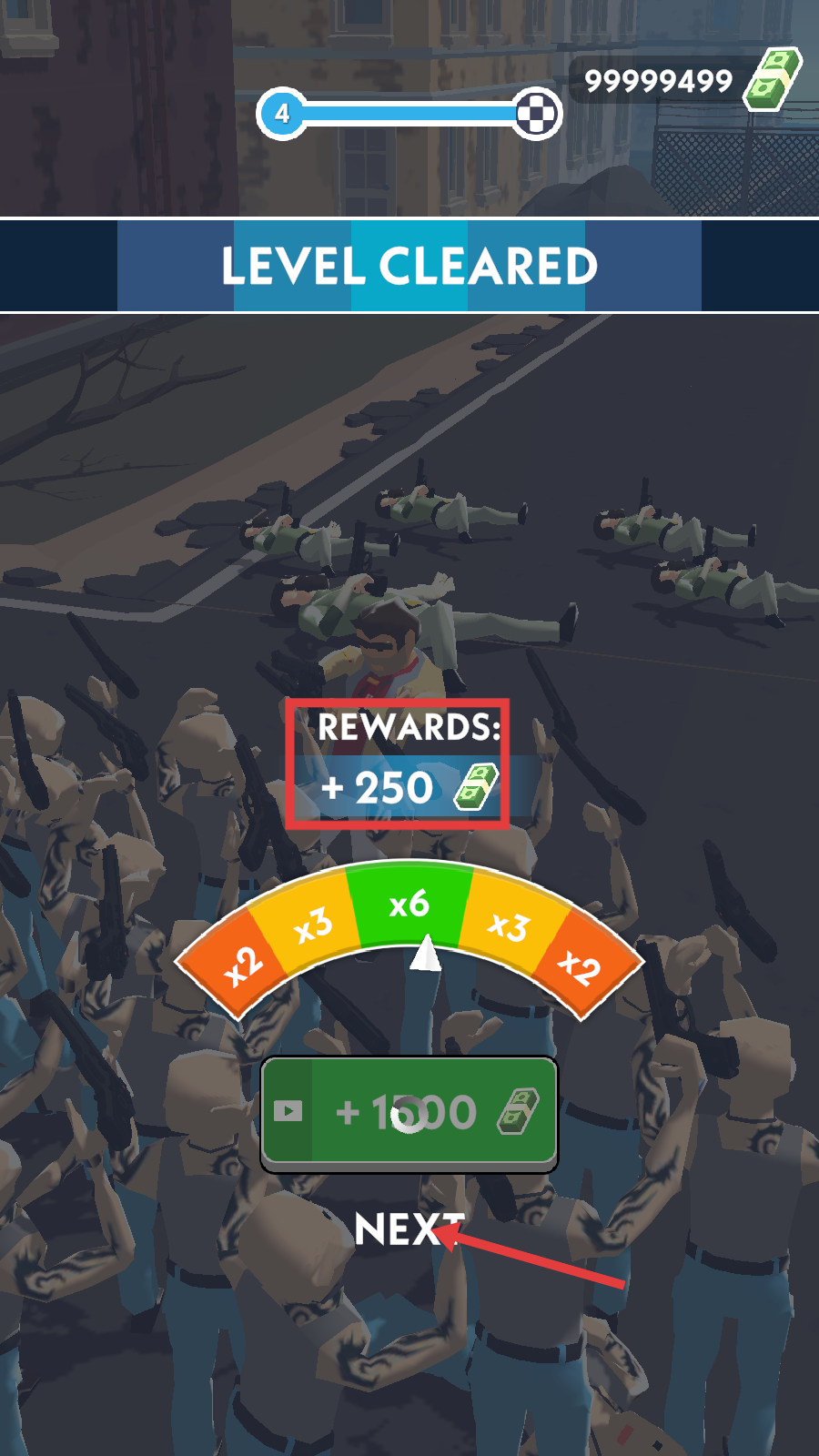 4、通关后领取【 250-货币】,点击【NEXT】,延续进程,挑战后续关卡。