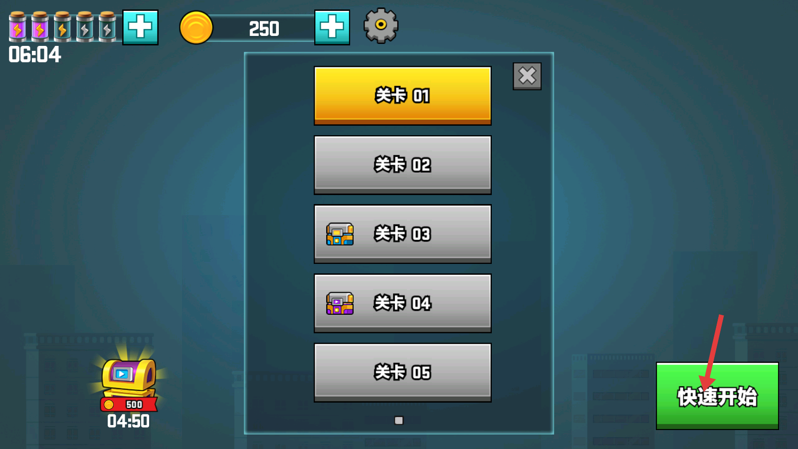 1、选定【关卡-01】,点击右侧【快速开始】,进入战斗,先熟悉操作与场景设定。