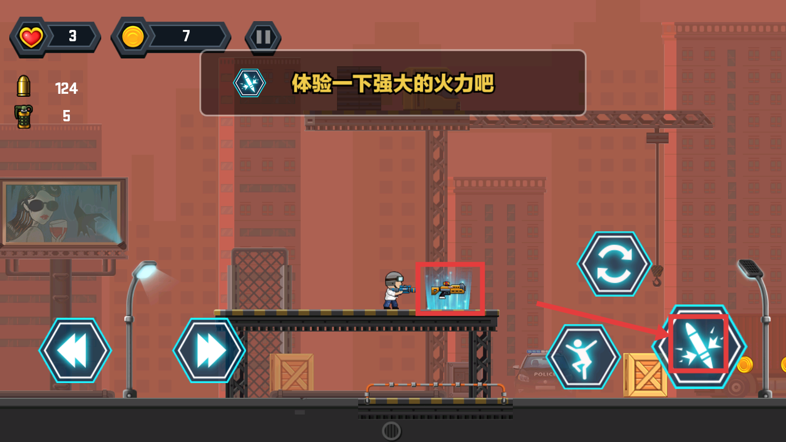 3、靠近武器箱获取新武器,点击右侧技能键释放火力,高效清敌,推进关卡进程。