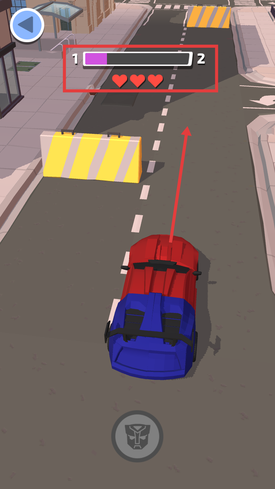 2、变形为汽车,沿道路推进,留意上方关卡进度与血量,突破障碍,接近目标区域。