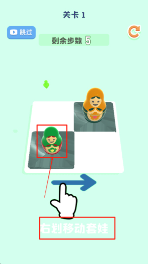 2、移动娃娃滑行:操控小娃娃在固定方块间左右移动滑行,调整位置尝试正确顺序,避开阻碍规划移动路径,逐步优化排列。