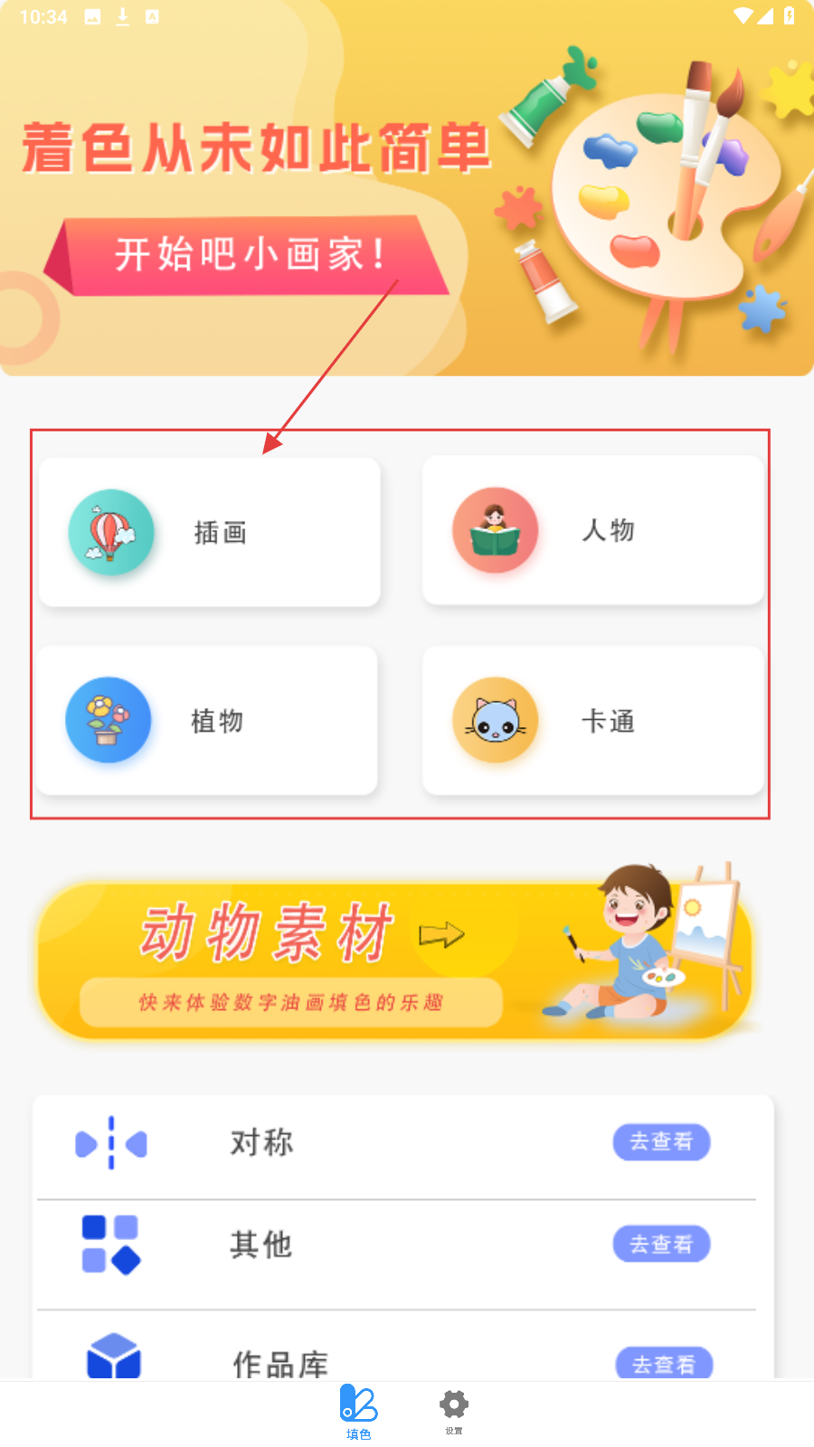 1、打开应用,在【填色】页面,有插画、人物等分类标签可以选择,如点击【插画】。