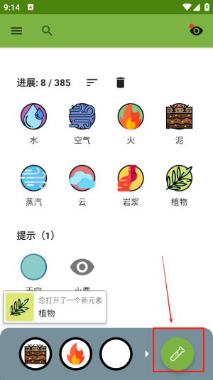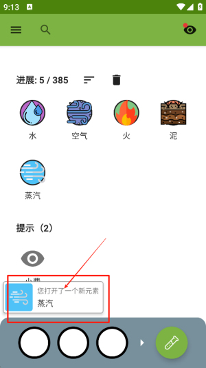 3、发现新元素:通过混合不同元素,你将发现并解锁新元素,如“蒸汽”。