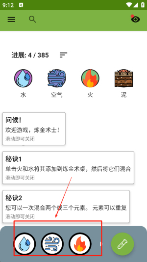 1、选择元素:在元素选择界面,点击“水”元素,开始你的炼金之旅。