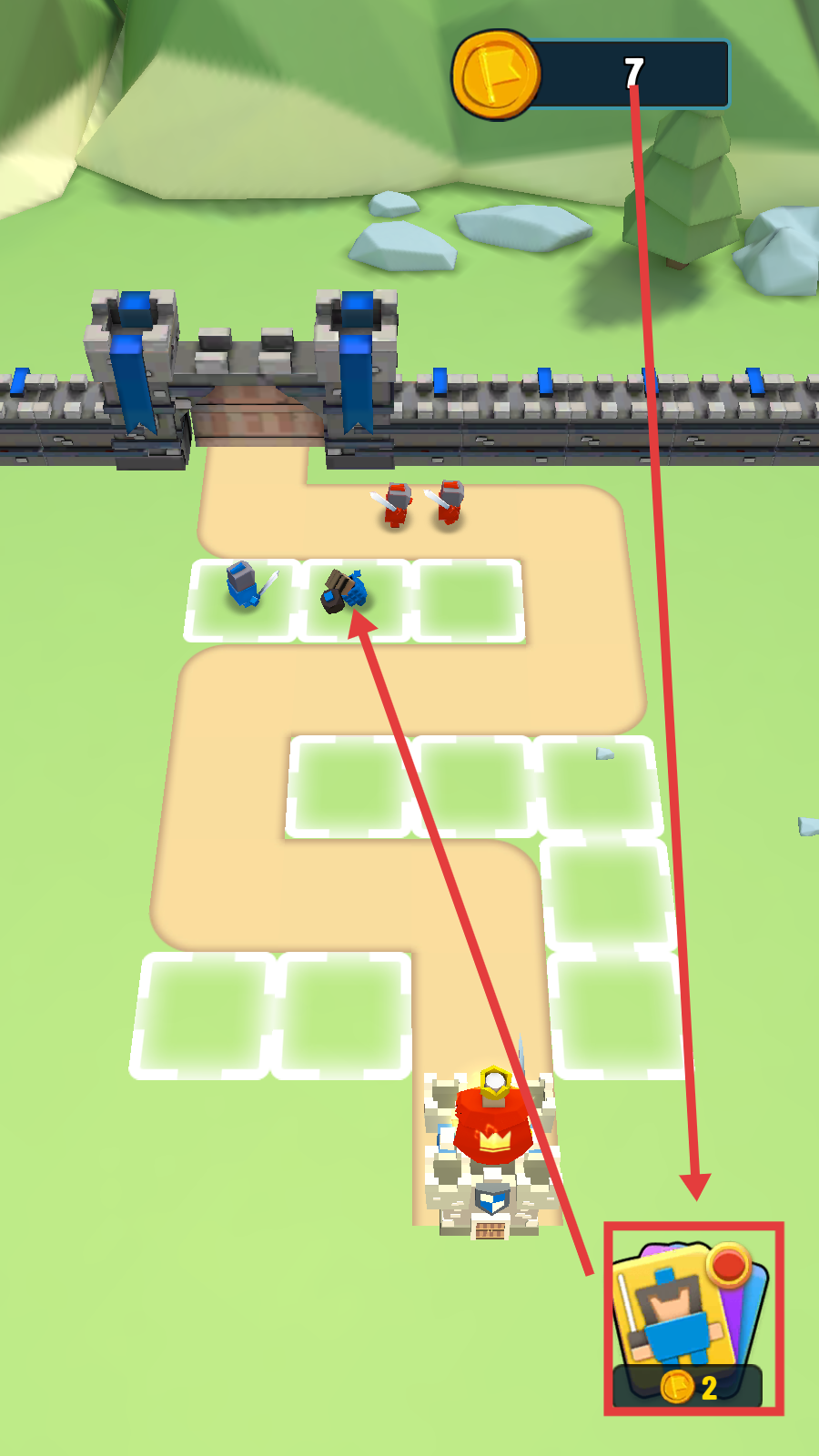 2、消耗金币,拖动右下角【英雄卡牌】部署至路径格子,召唤单位构建前线防御阵线。