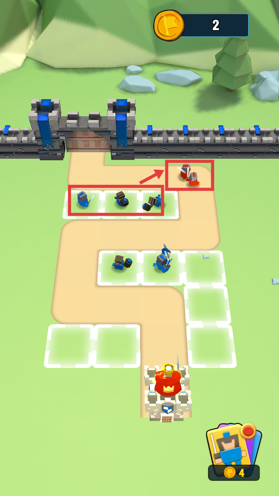 3、战斗中持续部署蓝色单位,分层拦截【红色敌人】,利用金币补充战力,稳固防御链。