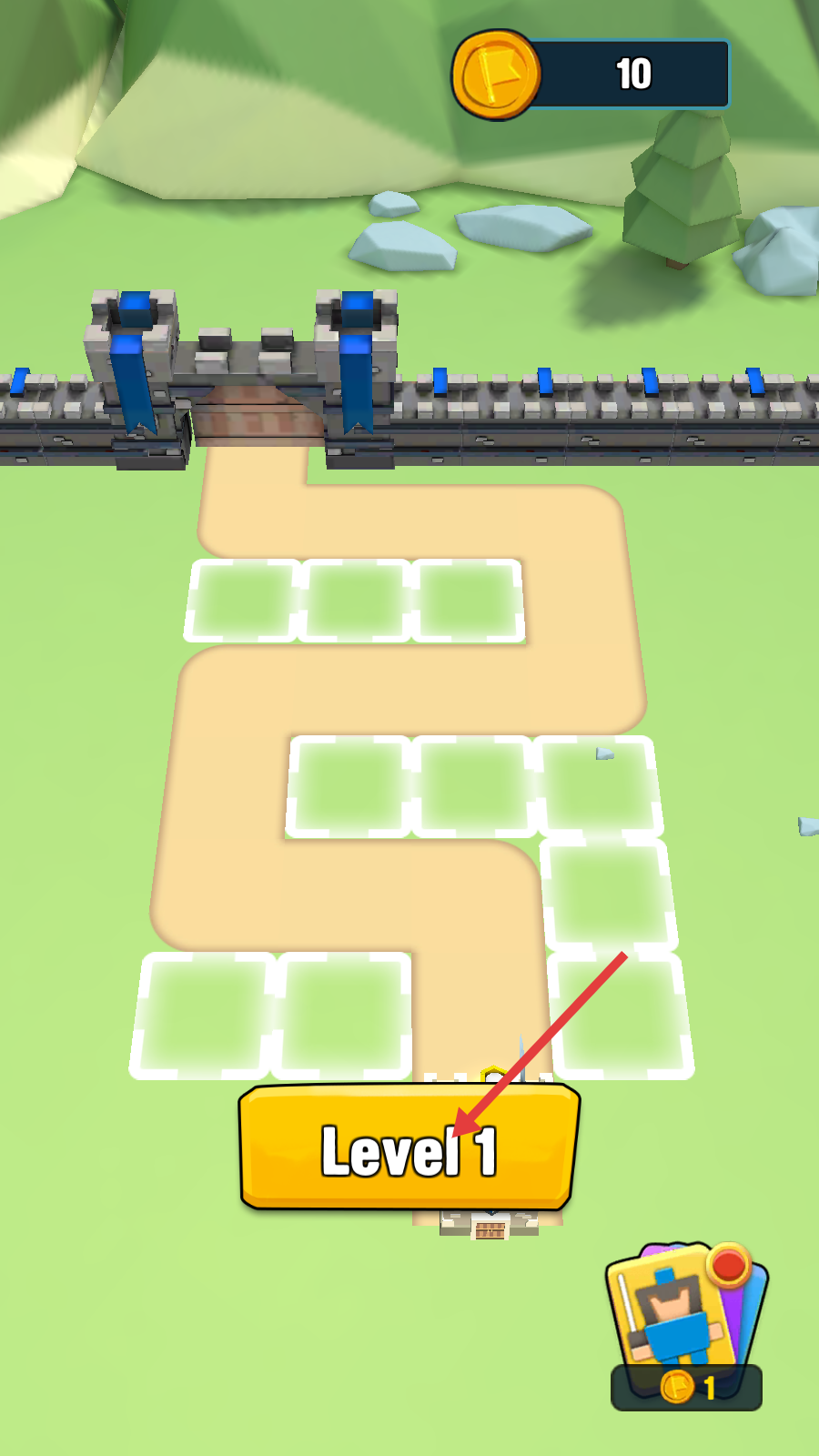 1、点击【Level-1】开启首关,初始持有【金币-10】,观察路径格子,规划防御布局起点。