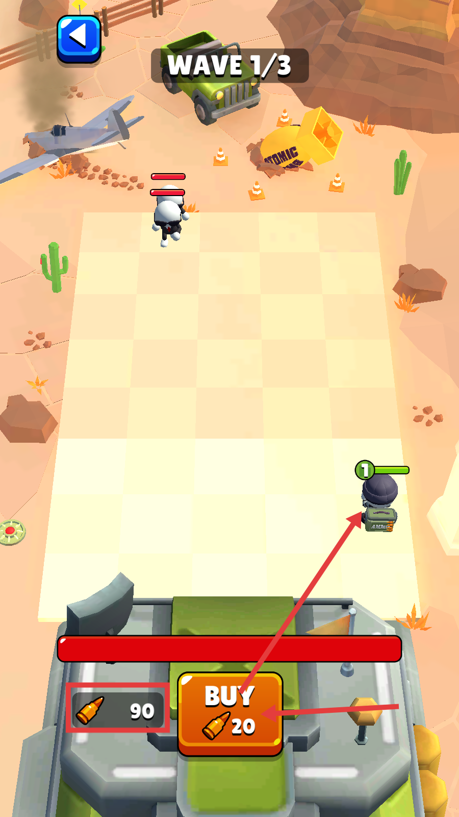 2、战斗中关注底部【子弹数(如90)】,点击【BUY】消耗子弹(如20)购买单位,部署在路径上拦截敌人,应对【WAVE1/3】首波攻势。