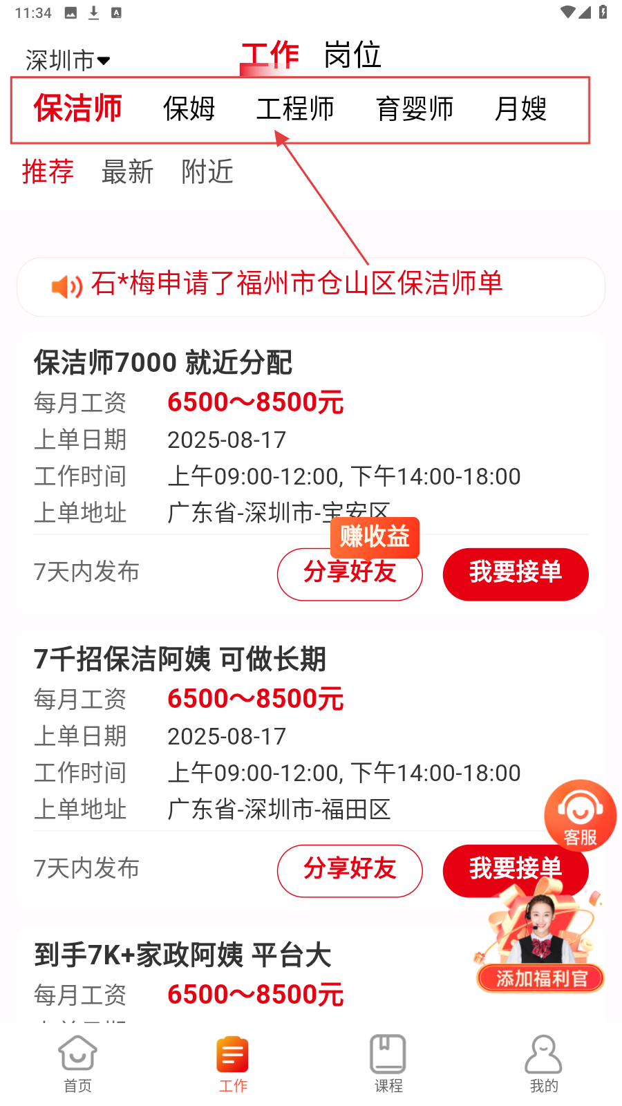 1、进入【工作】界面,选想找的岗位类型,如【保洁师】【工程师】等,浏览对应工作。
