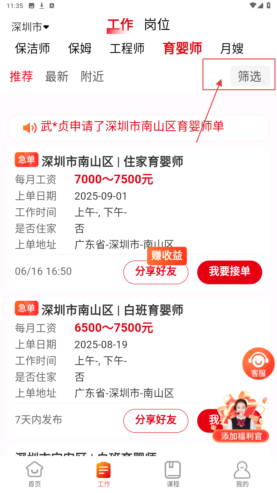 2、切换岗位到【育婴师】等,点【筛选】按钮,可精准找匹配工作。