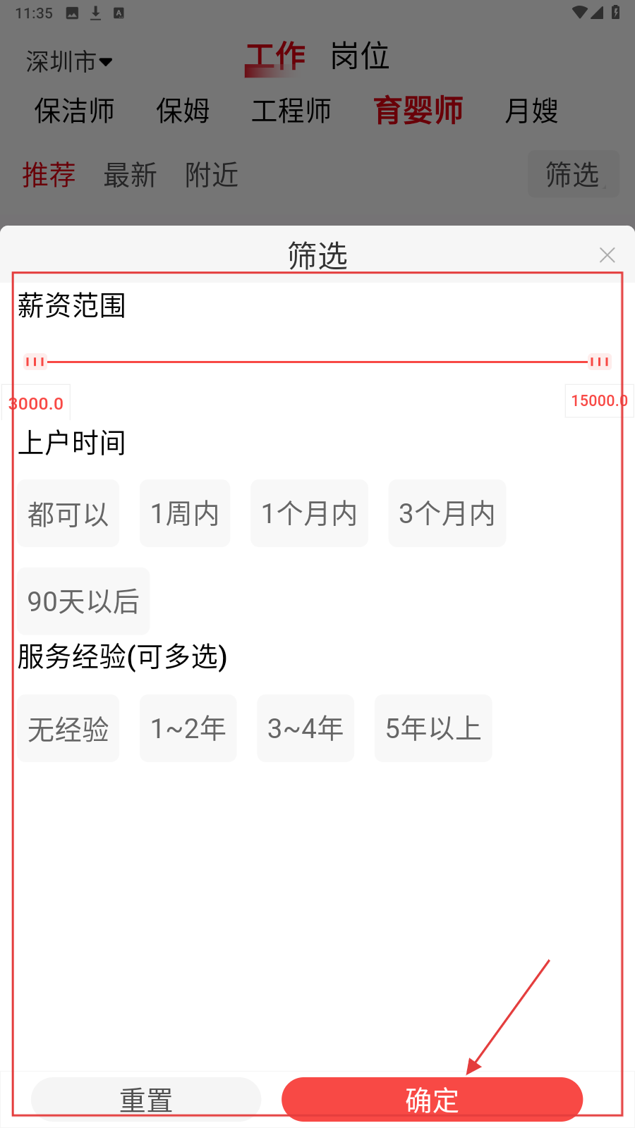 3、在【筛选】页,设置【薪资范围】【上户时间】等条件,点【确定】筛选岗位。