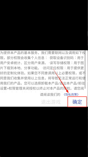 2、阅读政策:在权限说明页点击“确定”,接受《隐私政策》。