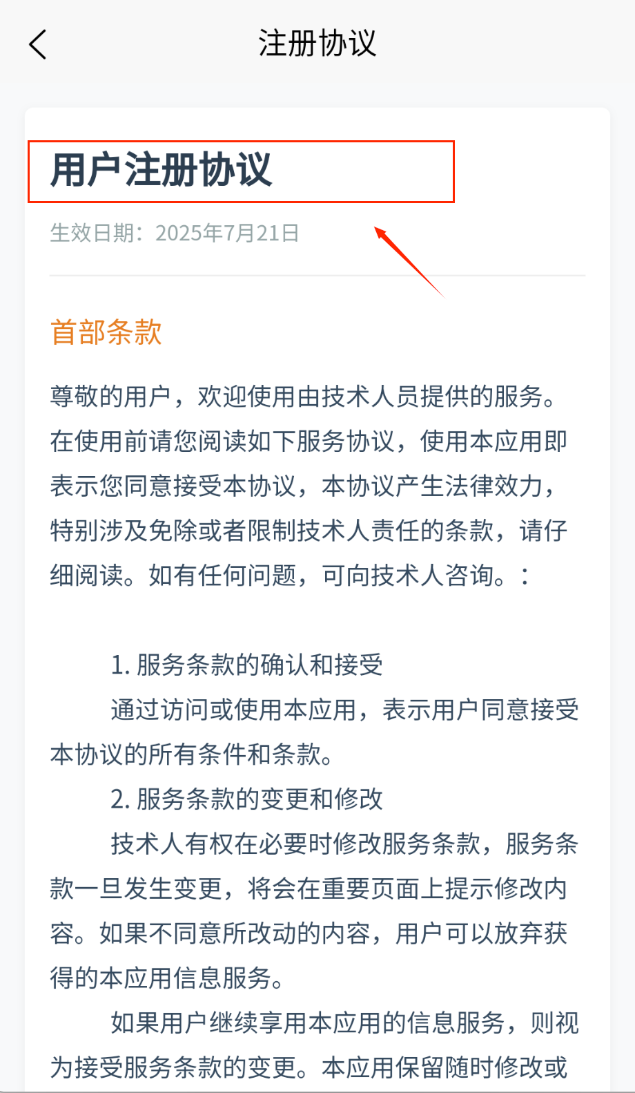 1、注册前要仔细阅读用户协议呢,协议顶部标明了2025年7月21日生效日期,里面详细说明了服务条款确认和变更规则。