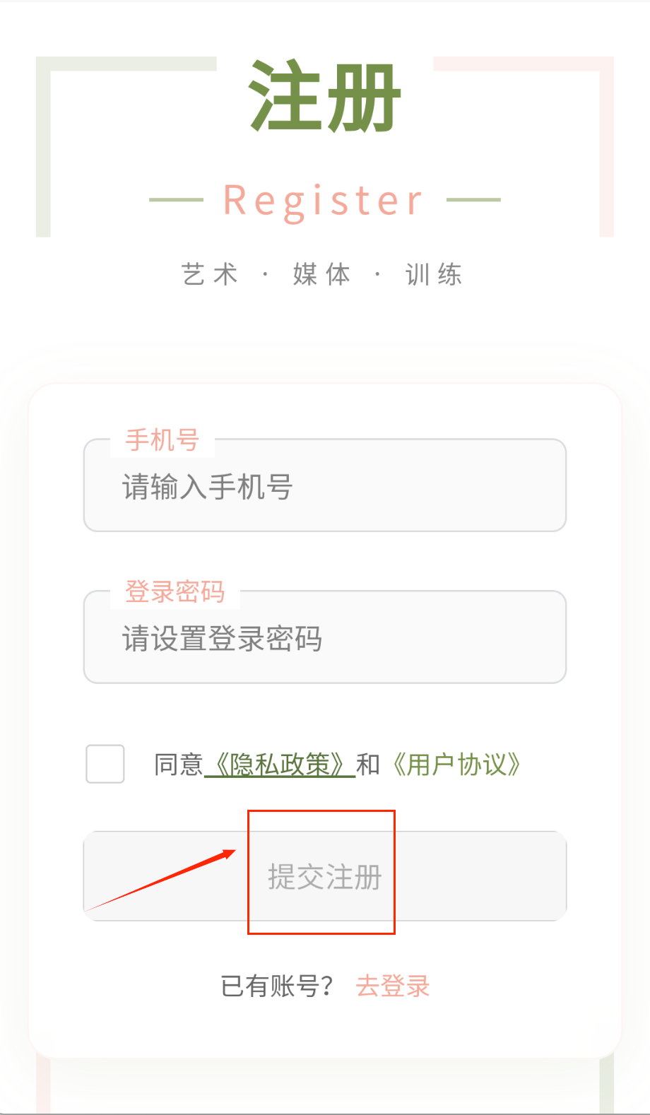3、注册页面需要输入手机号和设置密码,别忘了勾选同意隐私政策和用户协议那个小方框,填完点提交注册按钮就可以啦。