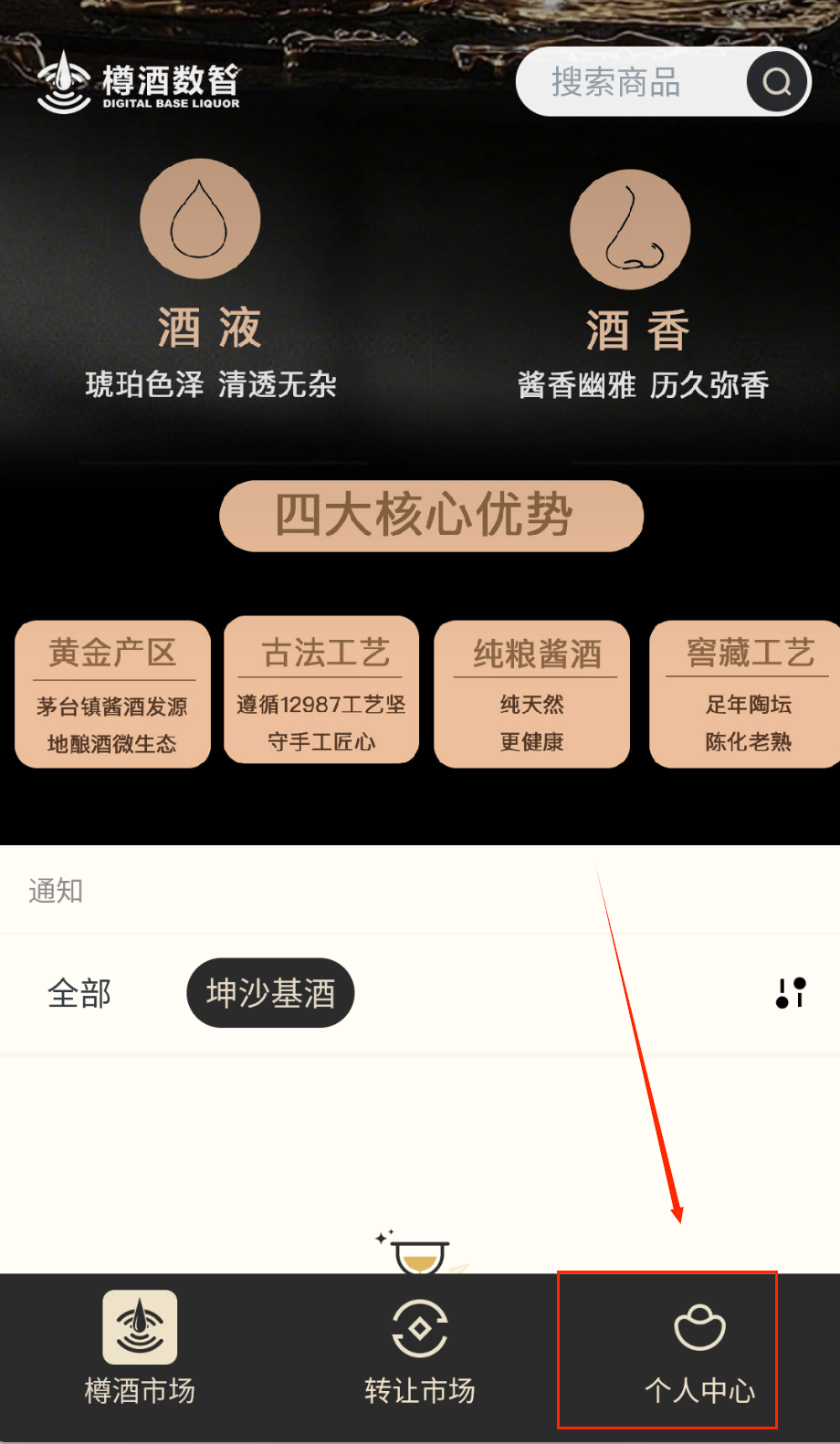 1、完成注册登录后进入首页浏览推荐酒品,顶部搜索栏支持输入品牌或香型快速定位目标商品,方便精准筛选所需品类。