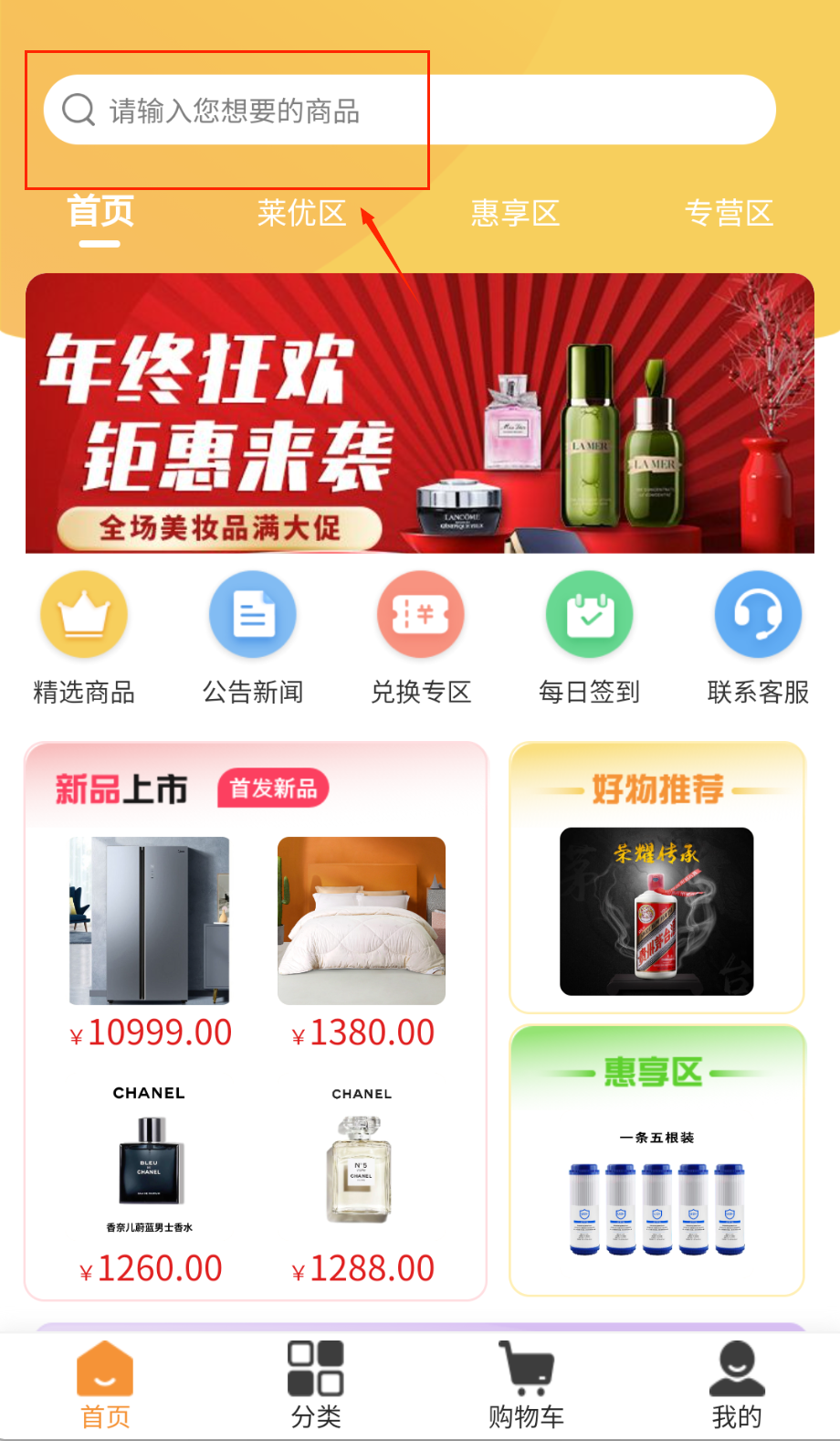 1、完成注册登录后进入首页浏览推荐商品,顶部搜索框支持输入关键词快速查找目标商品,新品专区展示最新上架产品。