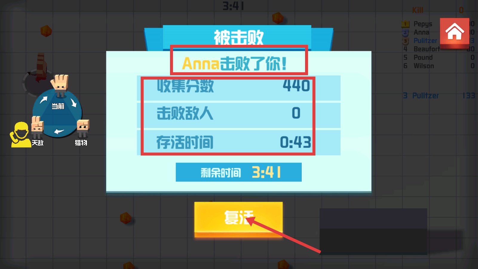 4、被Anna击败后,查看【收集分数-440】【击败敌人-0】【存活时间-0:43】数据,点击复活按钮继续挑战。
