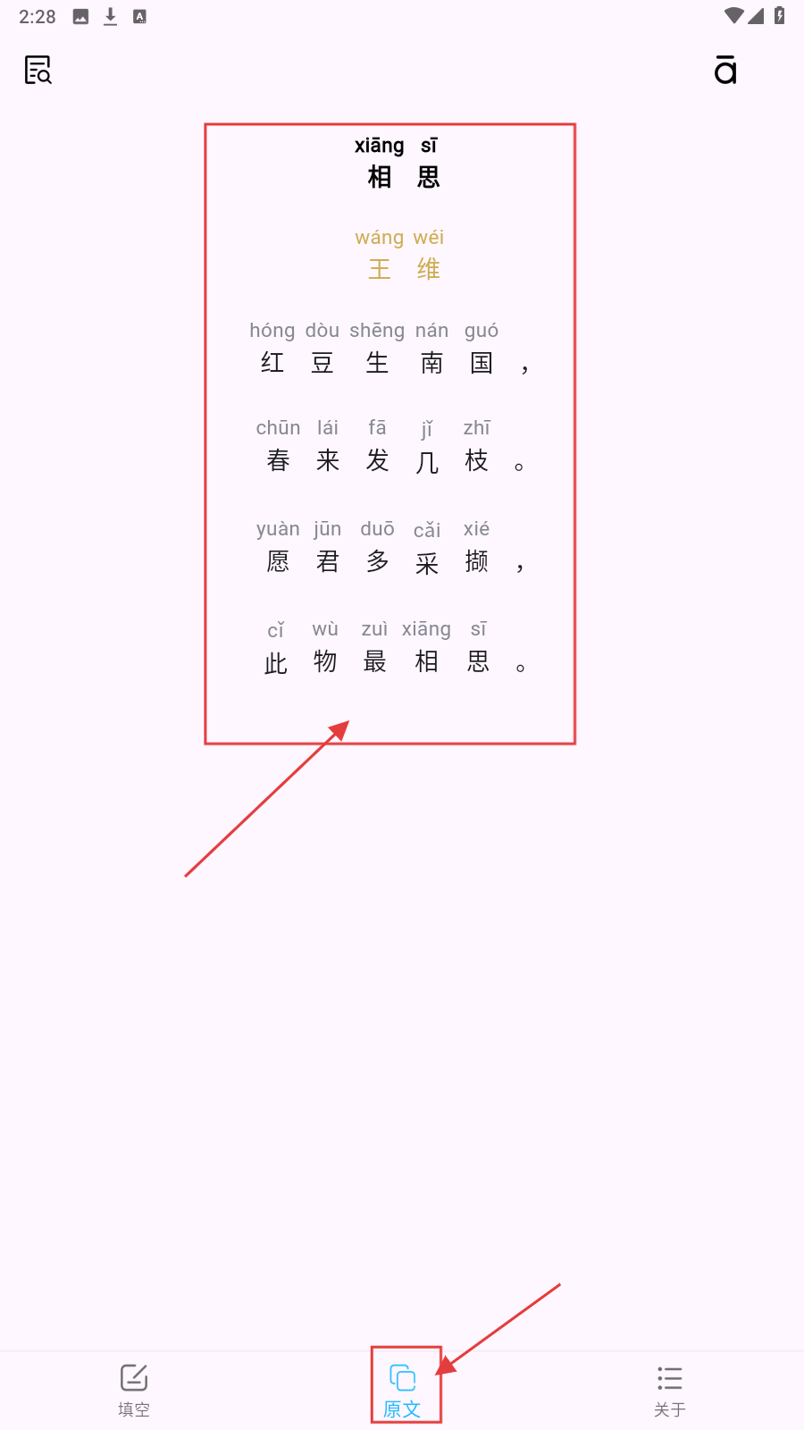 4、想复习原诗,点底部【原文】,查看带拼音的《相思》全诗,强化记忆。