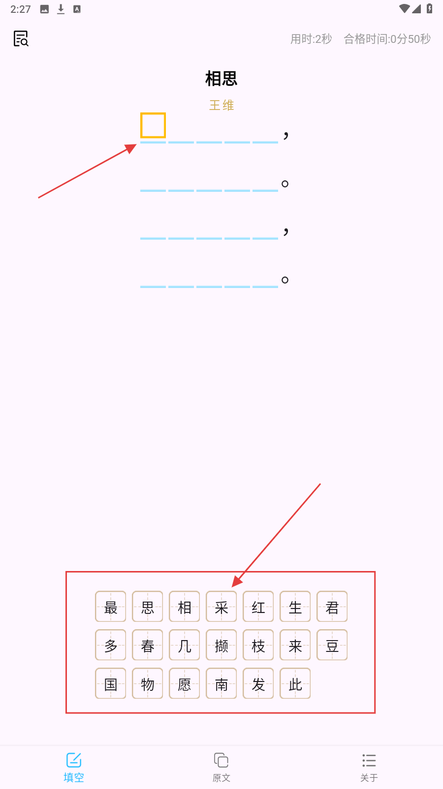 2、答题时,从下方字库选字,对应填入《相思》诗句空缺,注意顺序。