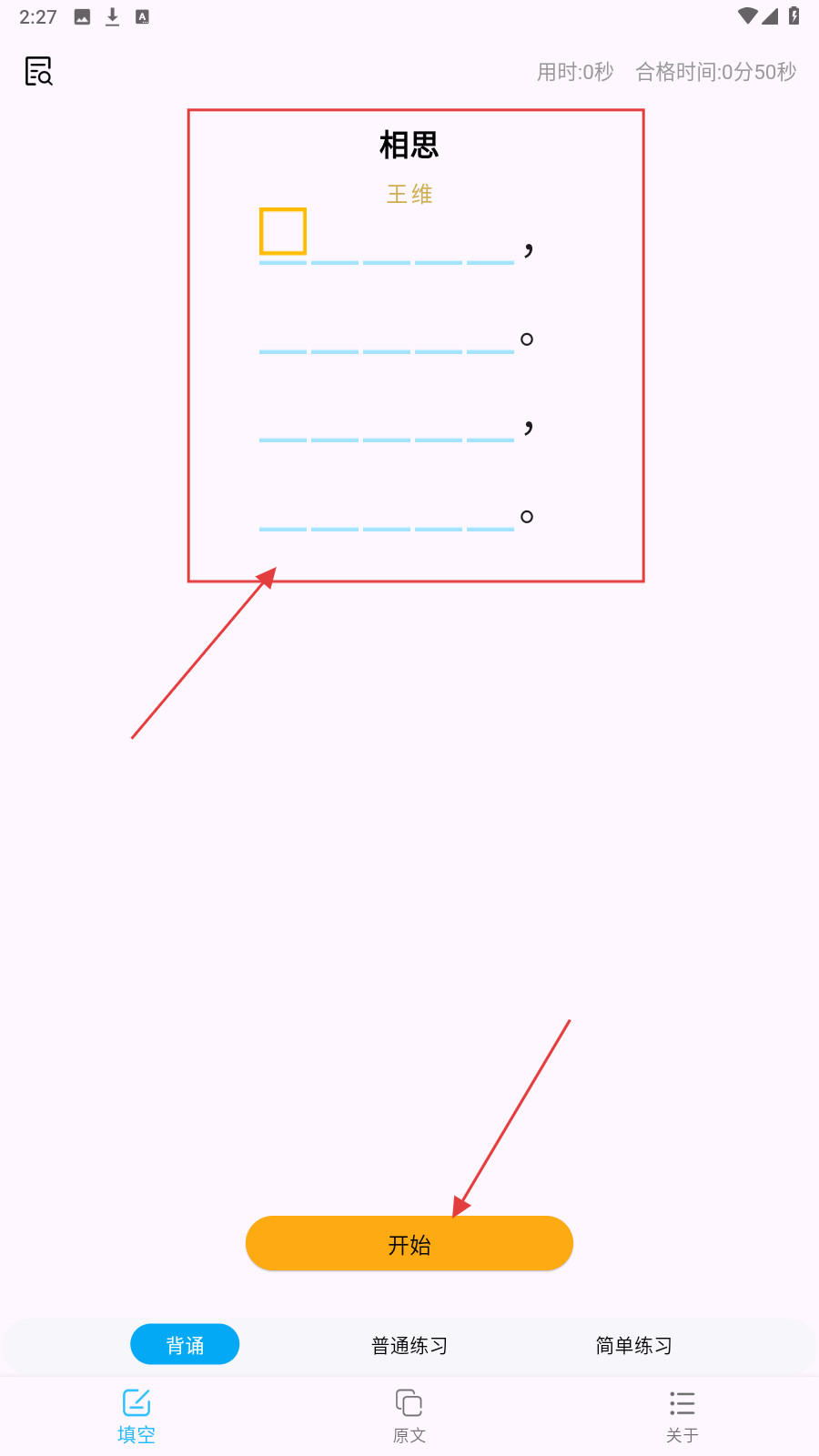 1、进入《相思》填空界面,点击【开始】,准备根据字库填诗句。