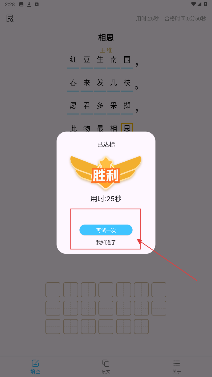 3、完成填空后,若达标可点【再试一次】重复练习,或【我知道了】退出。