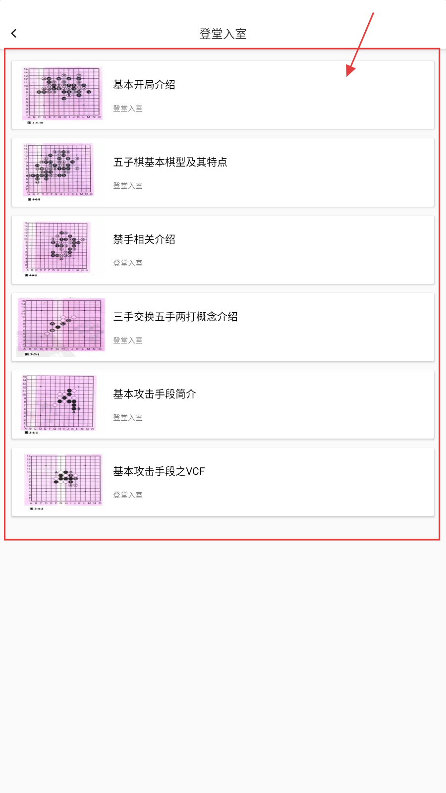 2、在【登堂入室】页,依次学习各项五子棋知识,从基础到进阶逐步了解。