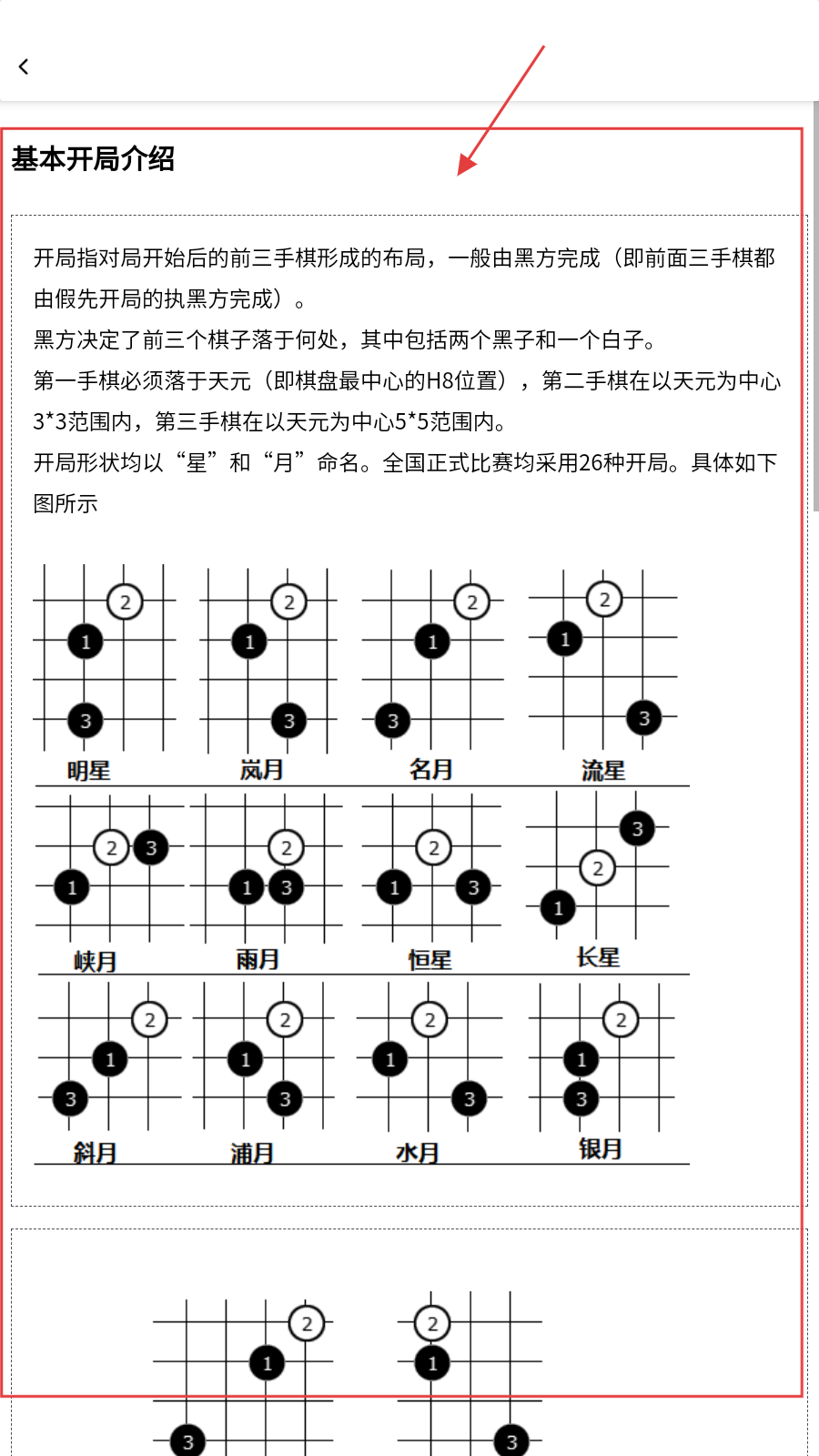 3、查看【基本开局介绍】,掌握黑方前三手落子规则与26种开局布局要点。